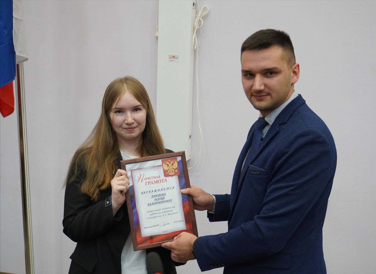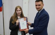 Почетную грамоту победителю конкурса и благодарность научному руководителю, а также полагающиеся от учредителя конкурса денежные призы вручил юрисконсульт Тульской областной нотариальной палаты Дмитрий Куршев.