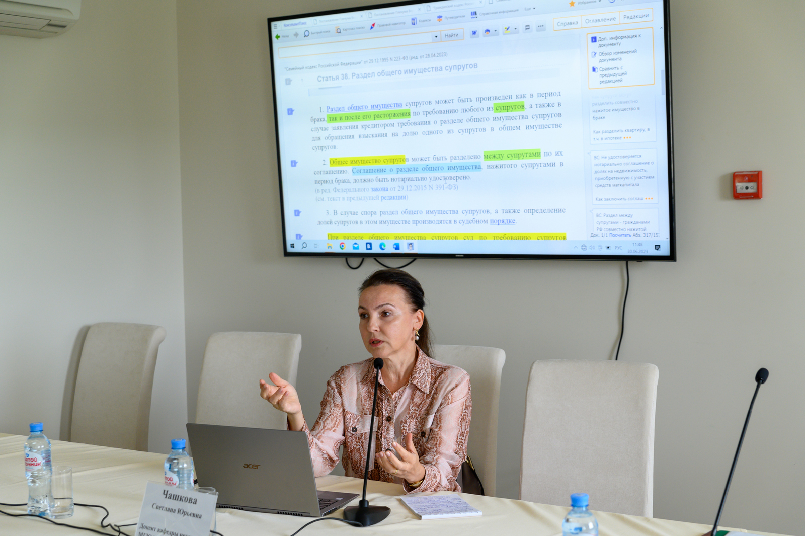 В своем выступлении С.Ю. Чашкова рассказала о том, что брачный договор и соглашение о разделе имущества являются правовыми инструментами, которые позволяют супругам регулировать свои имущественные отношения в браке. Лектор акцентировала внимание собравшихся на особенностях заключения данных сделок, подчеркнув, что брачные договоры и соглашения о разделе совместно нажитого супругами имущества должны быть составлены грамотно и юридически обоснованно, чтобы избежать проблем в реализации гражданами прав собственности в будущем.