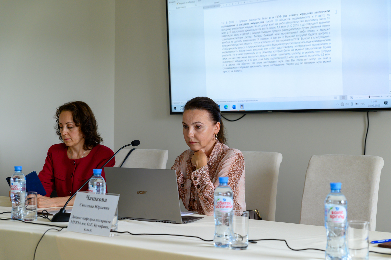 Мероприятие продолжилось семинаром с участием приглашенного лектора – доцента кафедры нотариата Московской государственной юридической академии им. О.Е. Кутафина Светланы Чашковой. Темой лекции стали брачный договор и соглашение о разделе имущества, нажитого супругами в период брака.